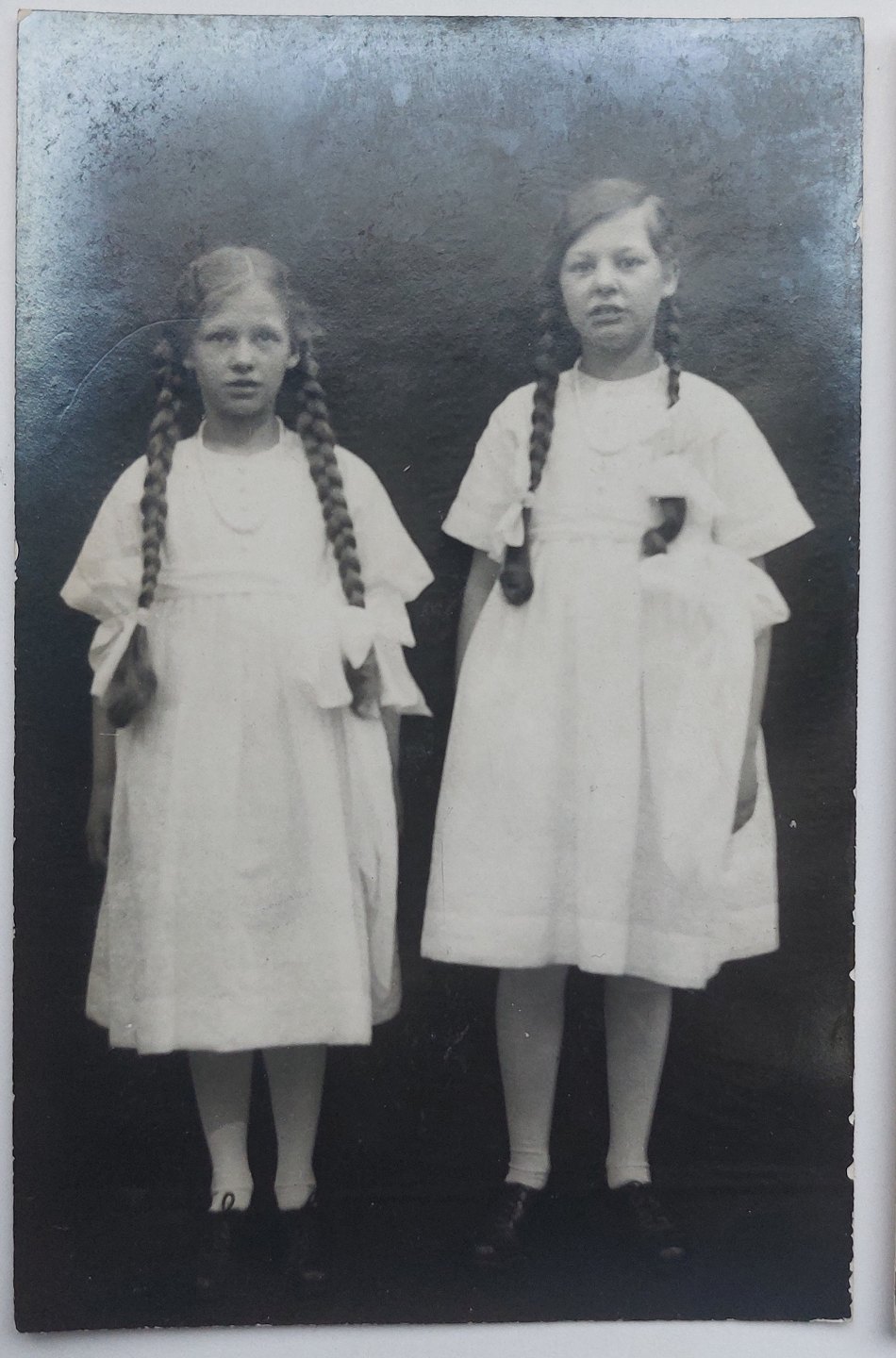 To ubrugte postkort: Portræt af to søstre med lange fletninger. I god stand