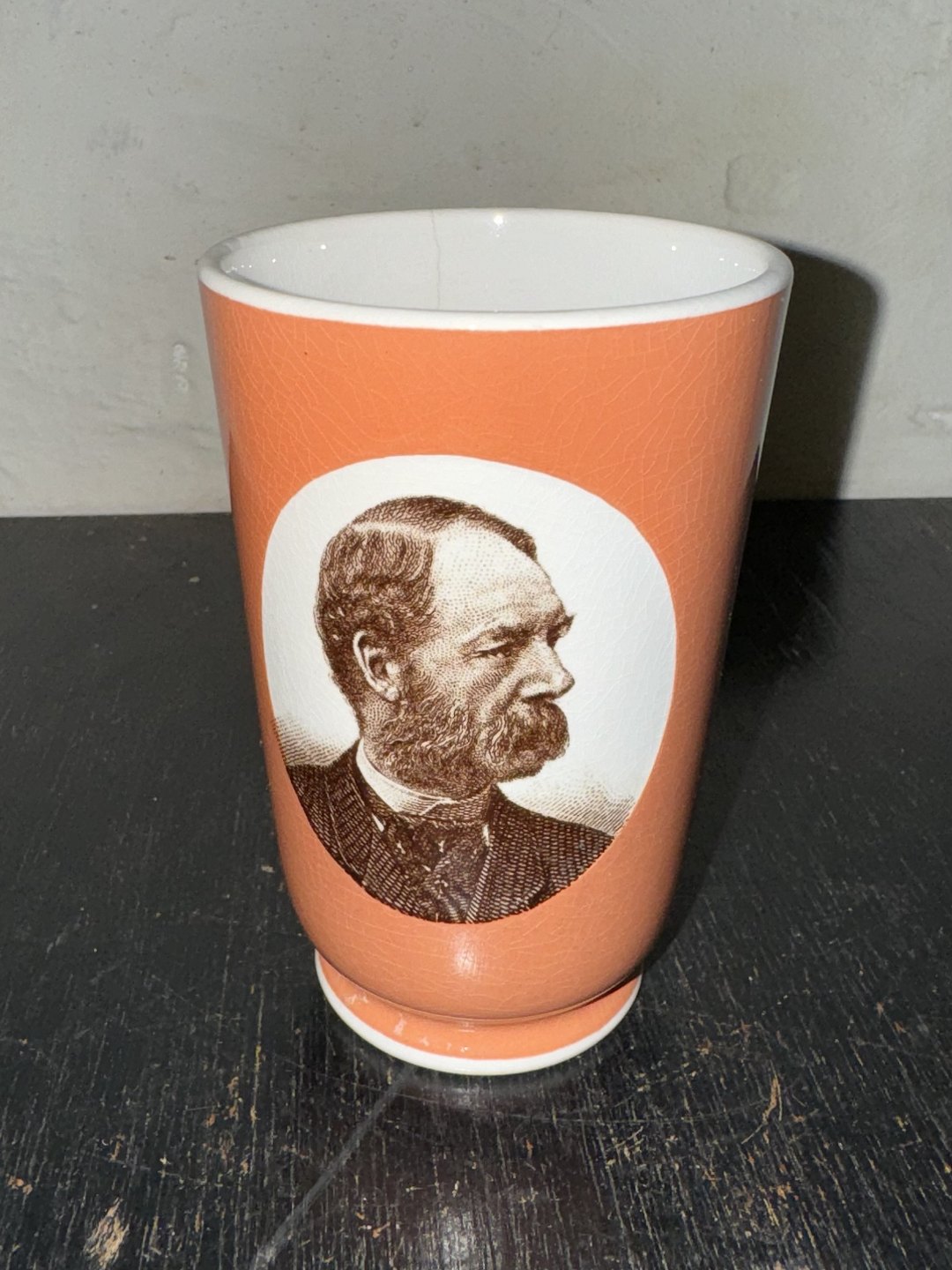 Brown cup in faience from Villeroy & Boch with a portrait of the Danish King Christian IX from around 1900. 3.5 cm long crack inside the cup. Otherwise in good condition. Factory mark on the bottom. H. 11½ cm (4.52 inches)