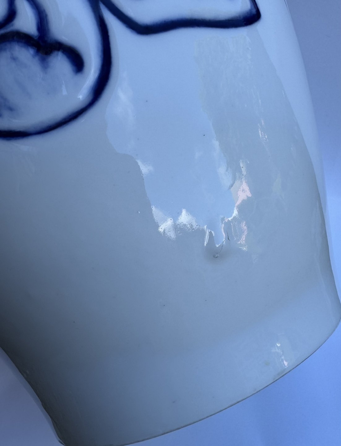 UNIKA KRUKKE FRA B&G: Krukke i porcelæn fra Bing & Grøndahl. Dekoreret i skønvirkestil af Svend Hammershøi (1873-1948), der arbejdede på fabrikken 1898-1900. I god stand uden skader eller reparationer. På den nederste del ses dog området med blærer, der er opstået i produktionen under brændingen. Mål: H. 32 cm. Åbningsdiameter på 13 cm Omkreds 24 cm