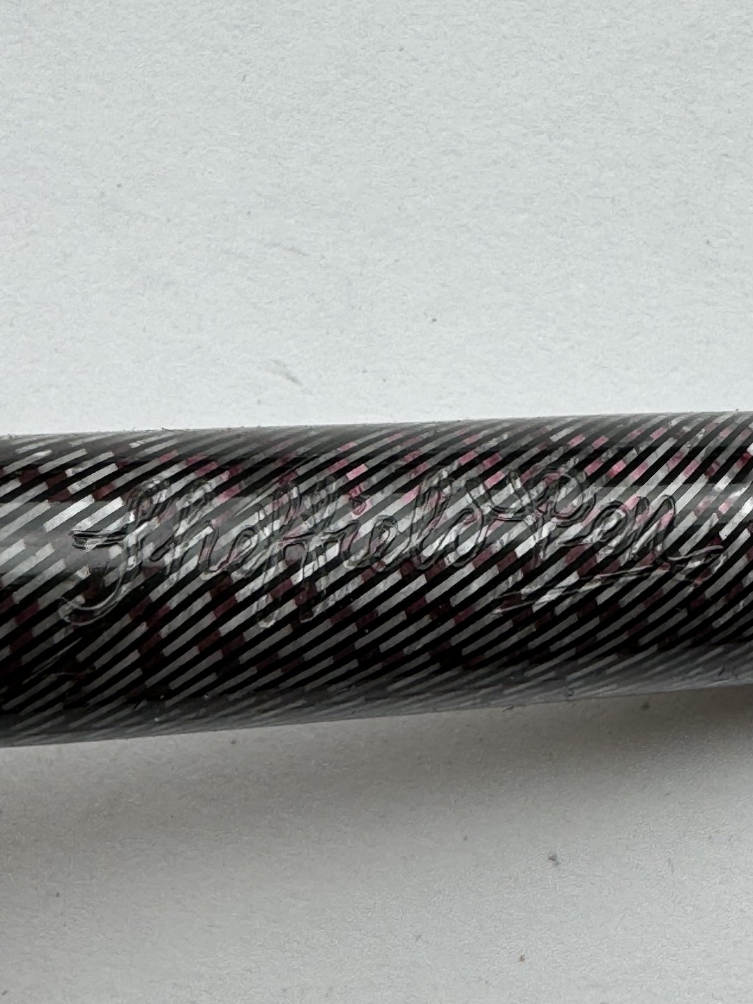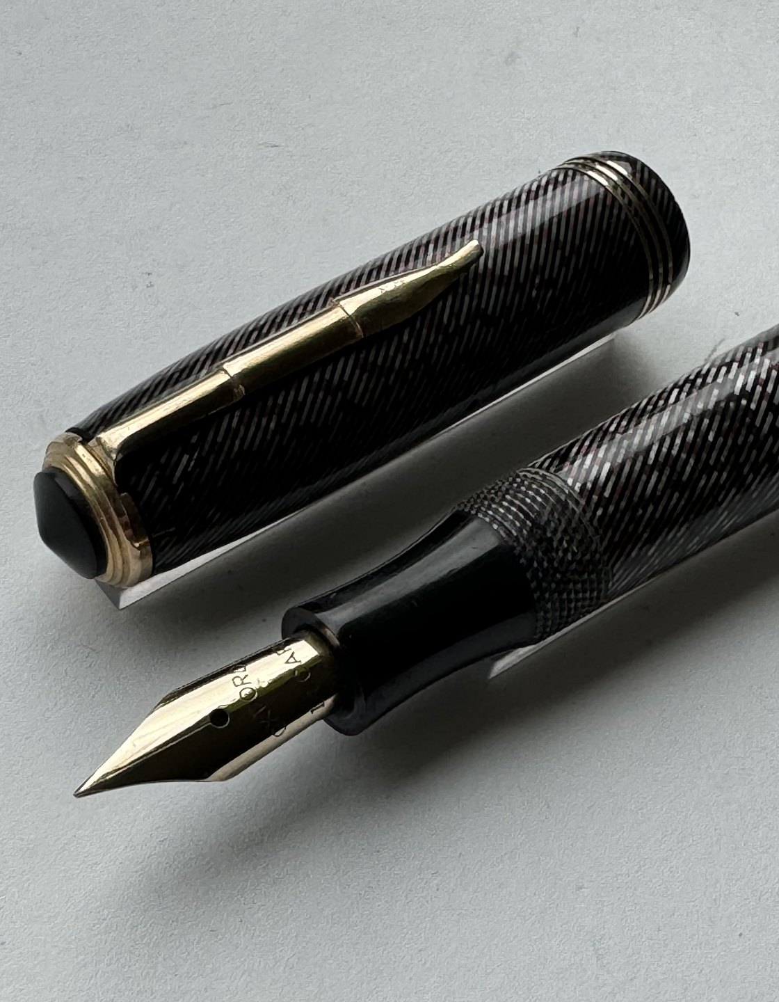 Silver and green spiral striped Sheffield Pen fountain pen made in the 1940s. The nib is a 14 carat gold nib from Oxford. Possibly a Danish product. For example, it has similarities to fountain pens made by Penol. Appears in good condition. Does not work. A new rubber sack must be inserted before the pen can absorb ink and write again. Dimensions: 12.2 cm