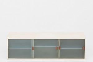 Unique wall-mounted cabinet in white painted mahogany with frosted glass doors and teak grip. Designed in 1949 Good, used condition 1 pc. in stockItem number. 1003935