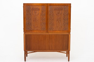 Unique linen-press in Honduras-mahogany w. tambour and decorative carvings, from 1950.
