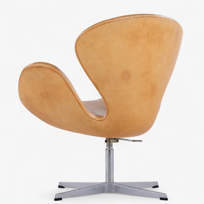 AJ 3320 - 'Swan' armchair in patinated natural leather on new base. Stamped by the manufacturer.