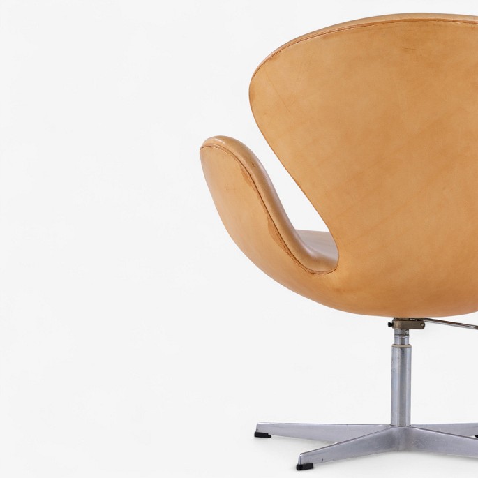 AJ 3320 - 'Swan' armchair in patinated natural leather on new base. Stamped by the manufacturer.