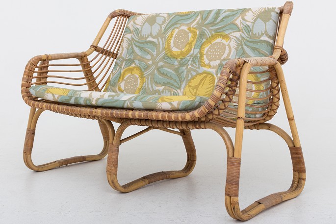 Wicker sofa w. new cushions in "La Foret, Lemon" See matching easy chairs w. ref. no. 1035382.