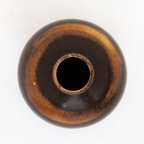 Kalabasformet vase i stentøj med brun harepelsglasur. Model 129. Stemplet.