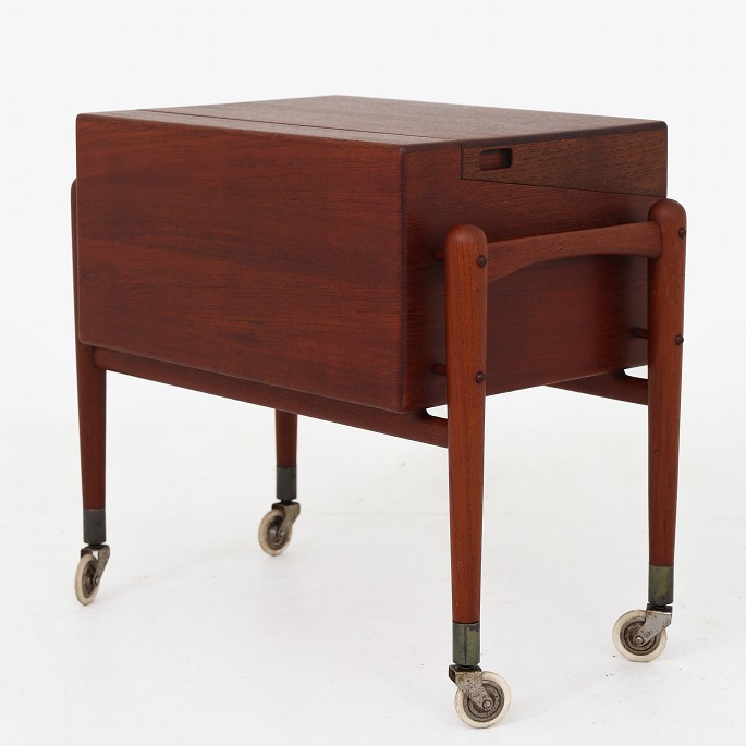 Rare sewing table in teak and maple on wheels from the 1950s.