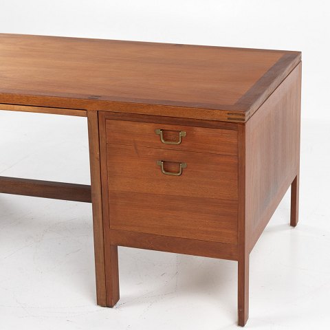 BM 66 - Skrivebord i mahogni med to skuffemoduler med skuffer og messinghåndtag.