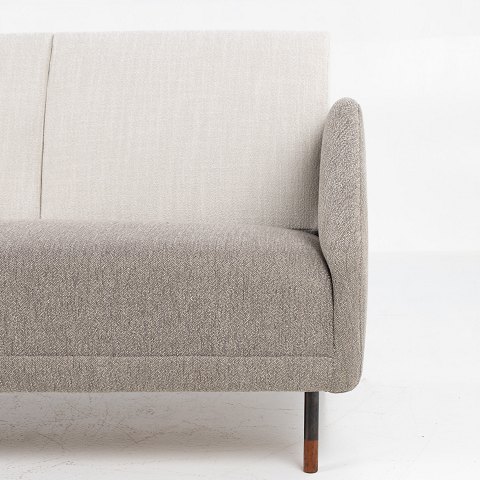 BO 77 - Upholstered 3-seater sofa in grey textile (Ecriture from Kvadrat, colors 270/210) with frame in oxidized steel and shoes in teak. Designed in 1953.