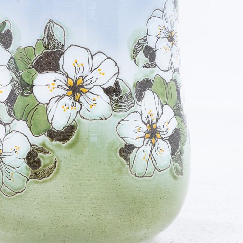 Vase i fajance med blomstermotiv.