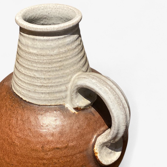 Gulvvase i stentøj med hank og jordlige nuancer.