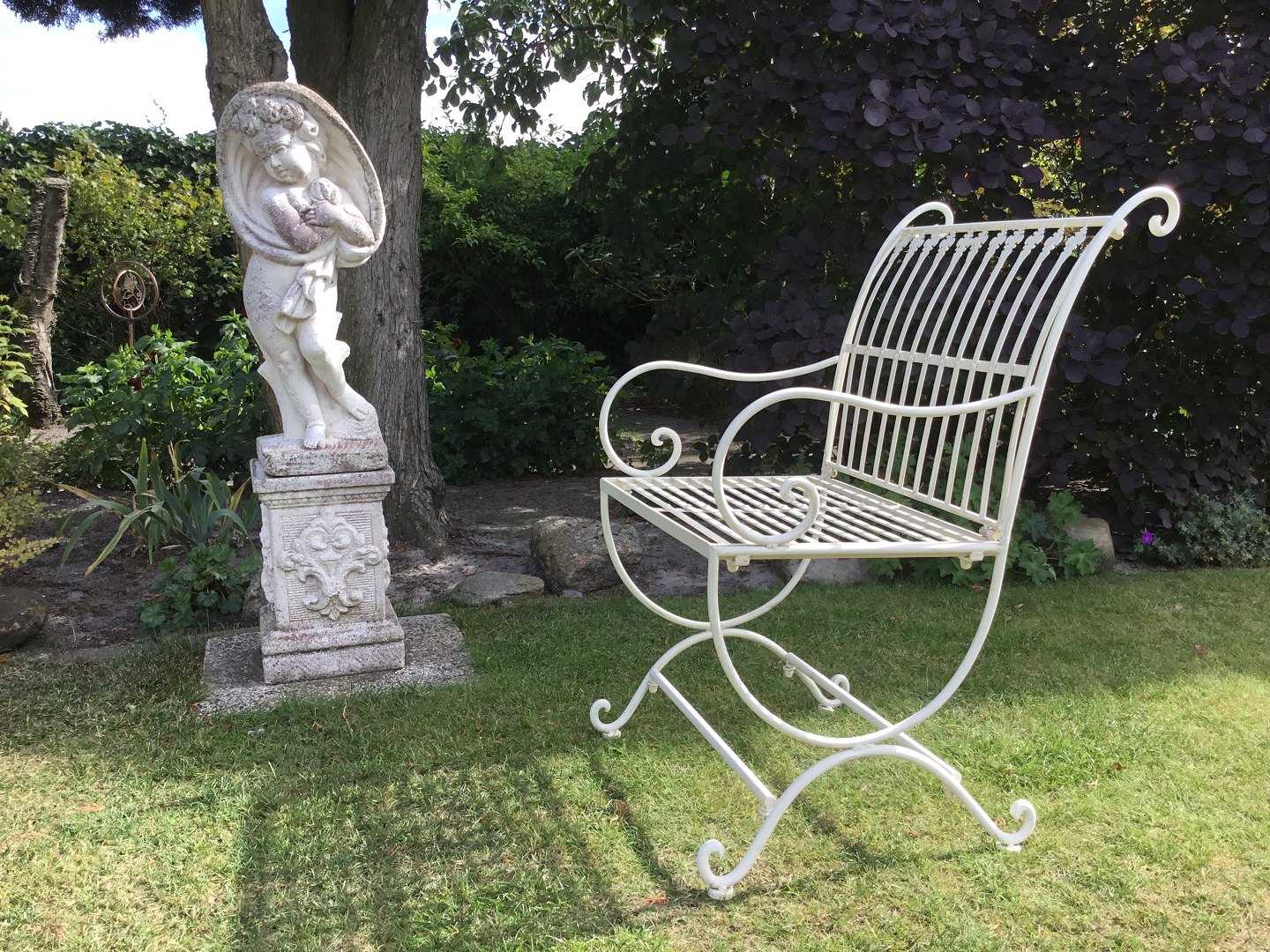 Wrought iron garden chair Garden chair made of handmade wrought iron, white patina painted Length 53 cm Depth 63 cm Height 86 cm Seat height 44 cm New condition with vintage look