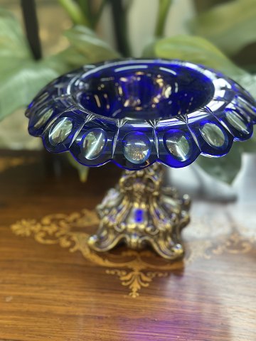 Bohemia Round bowl with wavy edge and large opening mounted on an ornamented metal base in Baroque style. Silver plated with decorated acanthus leaves and curved feet