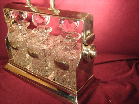 English Tantalus in silver plate with 3-cut crystal carafes and bottle emblems (GIN, PORT, SHERRY) 1800 end of the century