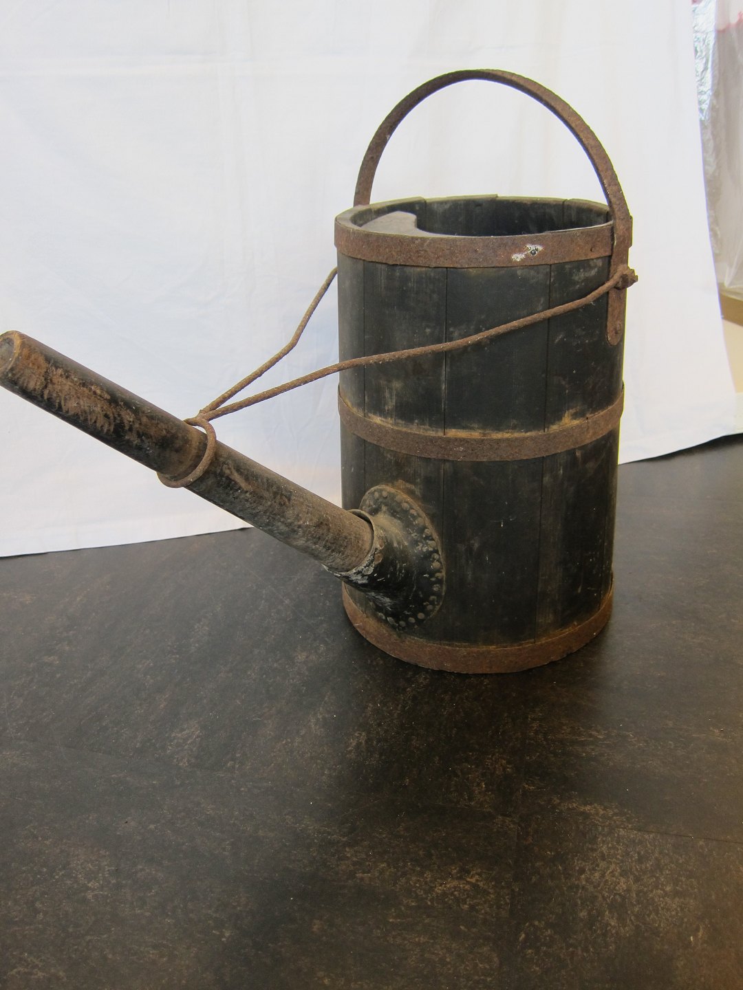 Old watering can made of wood and iron with a long spout
