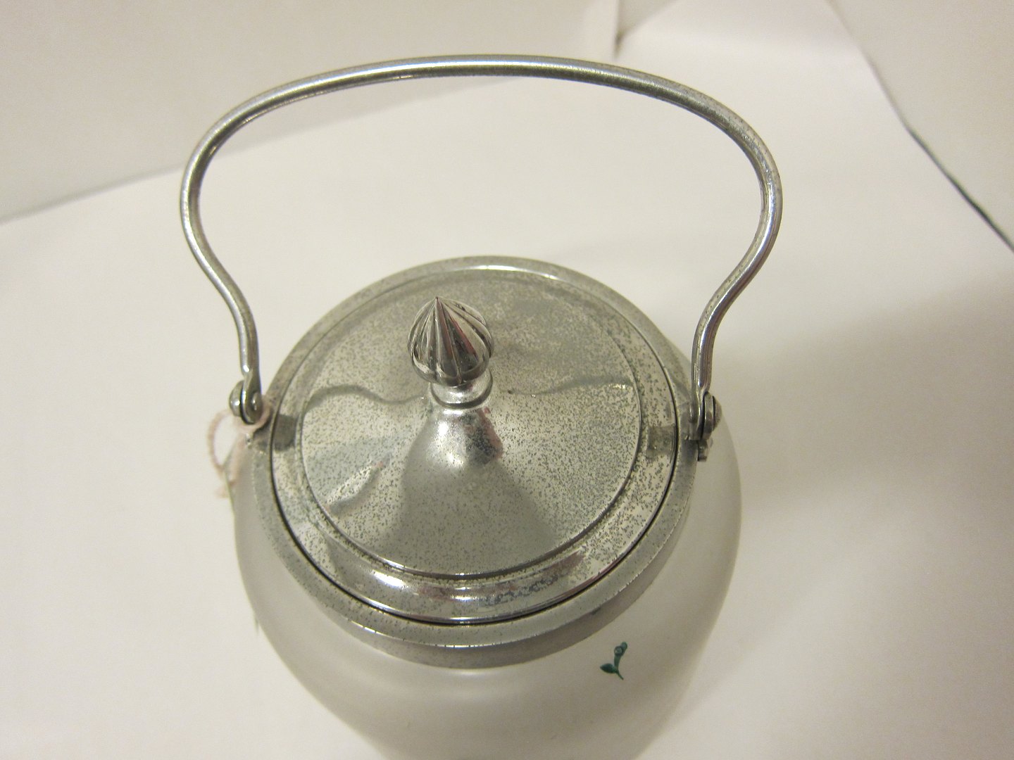 Biscuit-box made of painted glass with a nickeled lid, antique About 1900 In a good condition Articlenr.: 810131