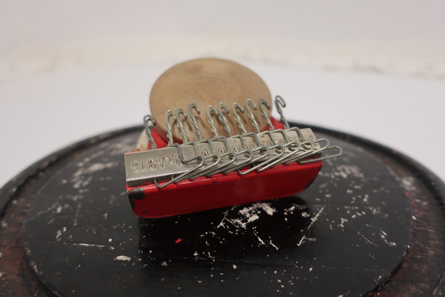 Elastikken til at fastgøre træklodsen til den rød metalplade, som er bukket i U-fomr nederst, medfølger.
