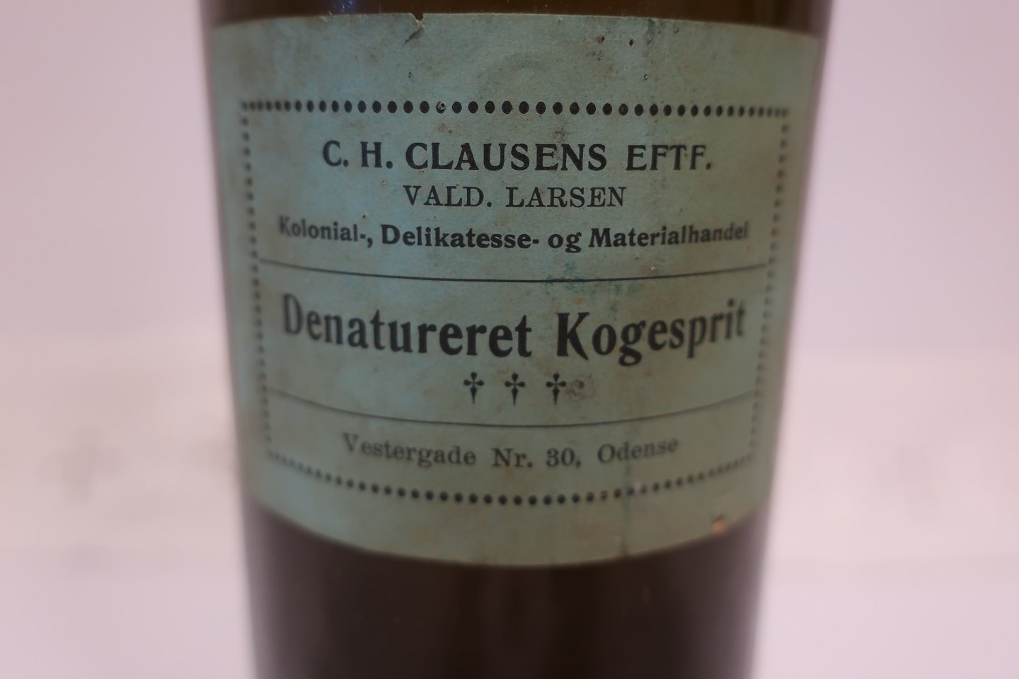 Gammel original flaske med etiketten "Denatureret Kogesprit"