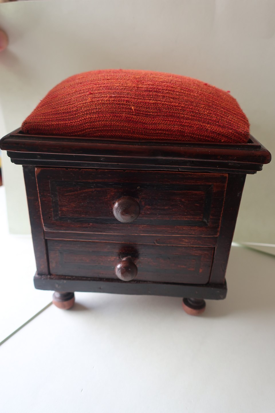 Antik nålepude med syskrin i form af 2 skuffer Kan fastgøres til kanten af bordet Med nymonteret nålepude med gammelt stof Smuk og praktisk H: 16cm B: 14,5cm D: 12cm I god stand Varenr.: 2-4115