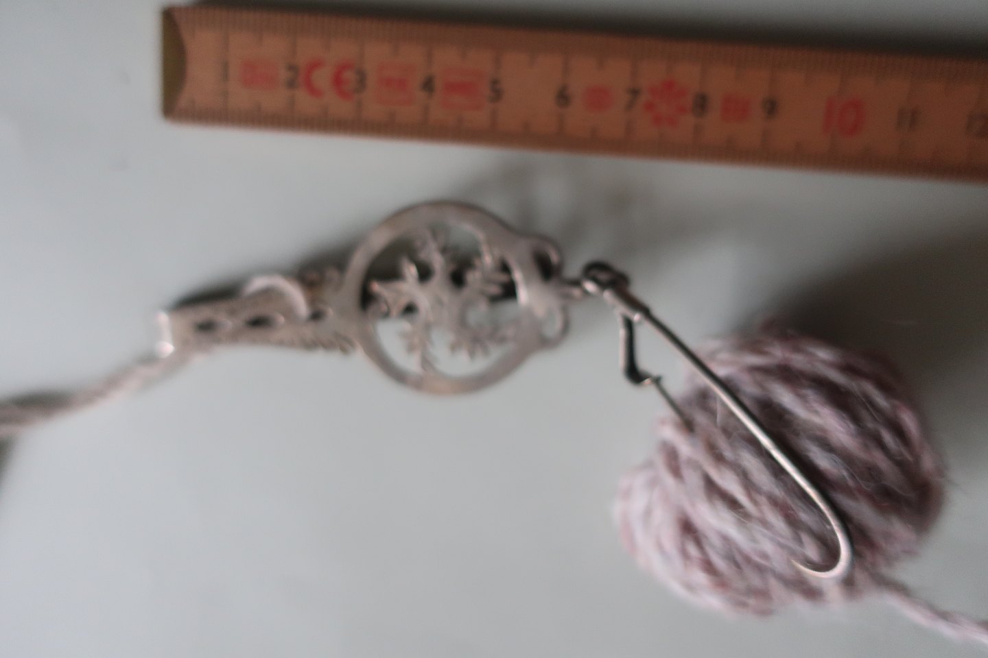 You placed the "giljekrog" at the left side of your dress, and then you placed the yarn at the "giljekrog" and then you were able to walk around knitting without caring about the yarn rolling away