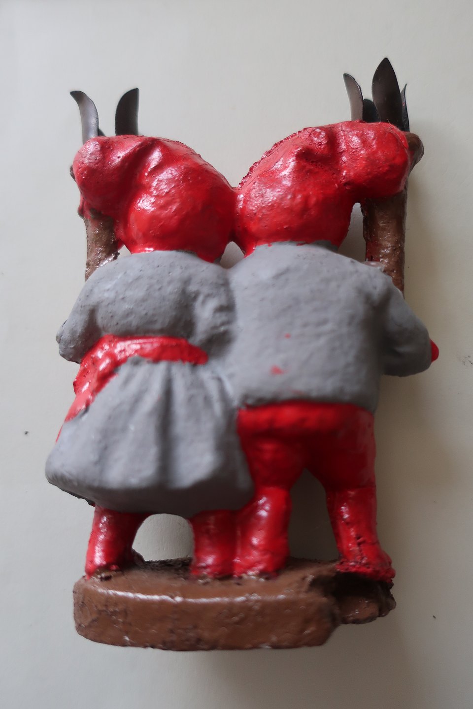 2 gamle lysestager i form af nissefar og nissemor med lysetager som fakler (lavet af metal)
